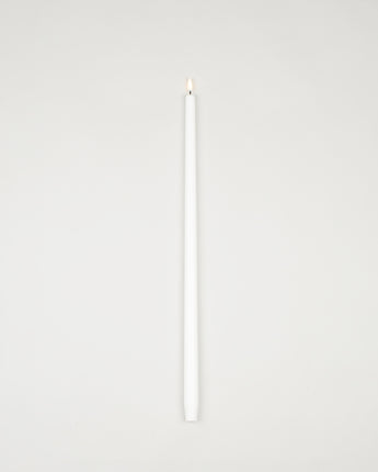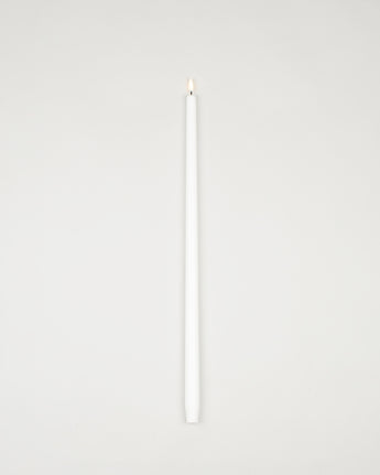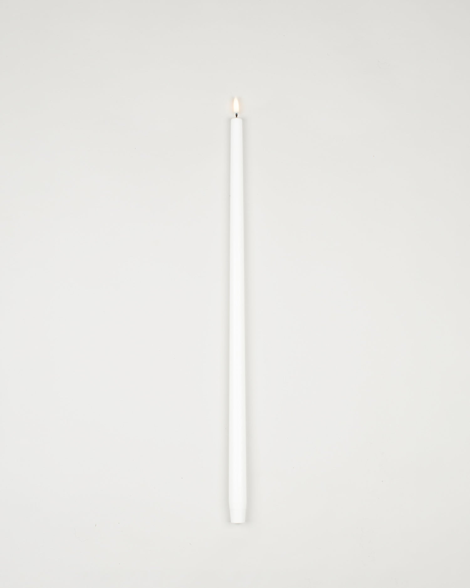 Ett elegant och ovanligt högt LED-ljus i klassisk stearinljusform, perfekt för att skapa en dramatisk men sofistikerad atmosfär. Med sin slanka siluett och rena vita färg passar det utmärkt i höga ljusstakar, på middagsbordet eller som en del av en dekorativ grupp. Den naturtrogna 3D-lågan lyser med ett varmt, fladdrande sken som för tankarna till levande ljus – utan att smälta eller sota.