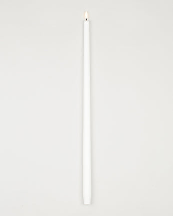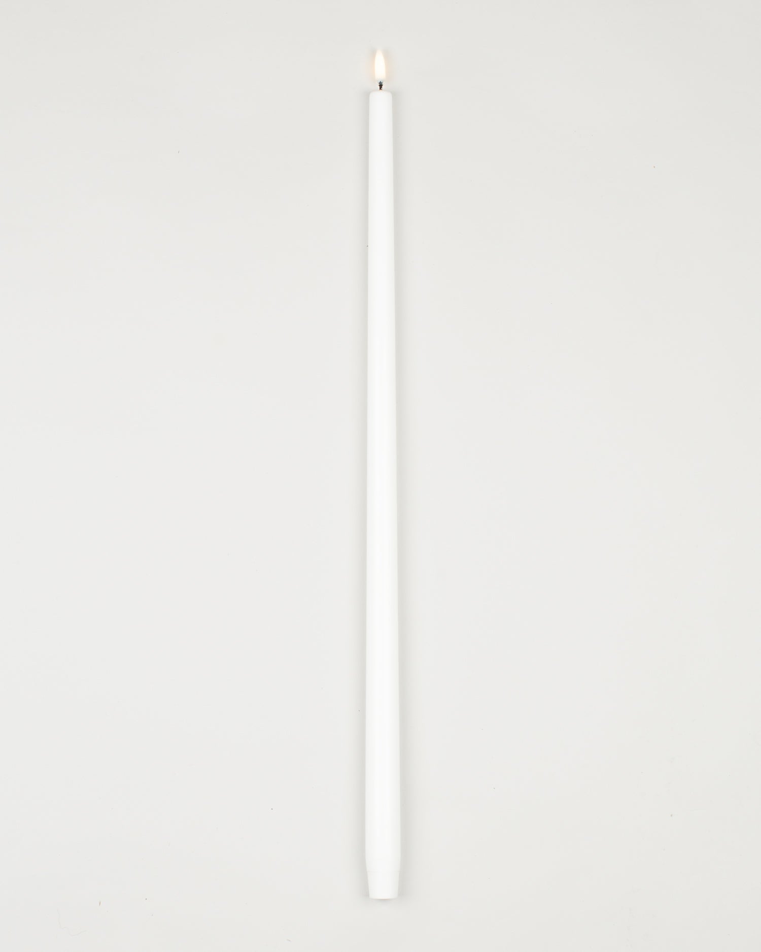 Detta imponerande 75 cm höga LED-ljus i klassisk tappform är skapat för att synas. Den eleganta siluetten och den naturtrogna 3D-lågan skapar en lyxig känsla – perfekt för stora matsalar, entréer eller vid festdukningar där du vill addera höjd och närvaro. Den vita, släta ytan efterliknar äkta stearin och passar vackert i högre ljusstakar.