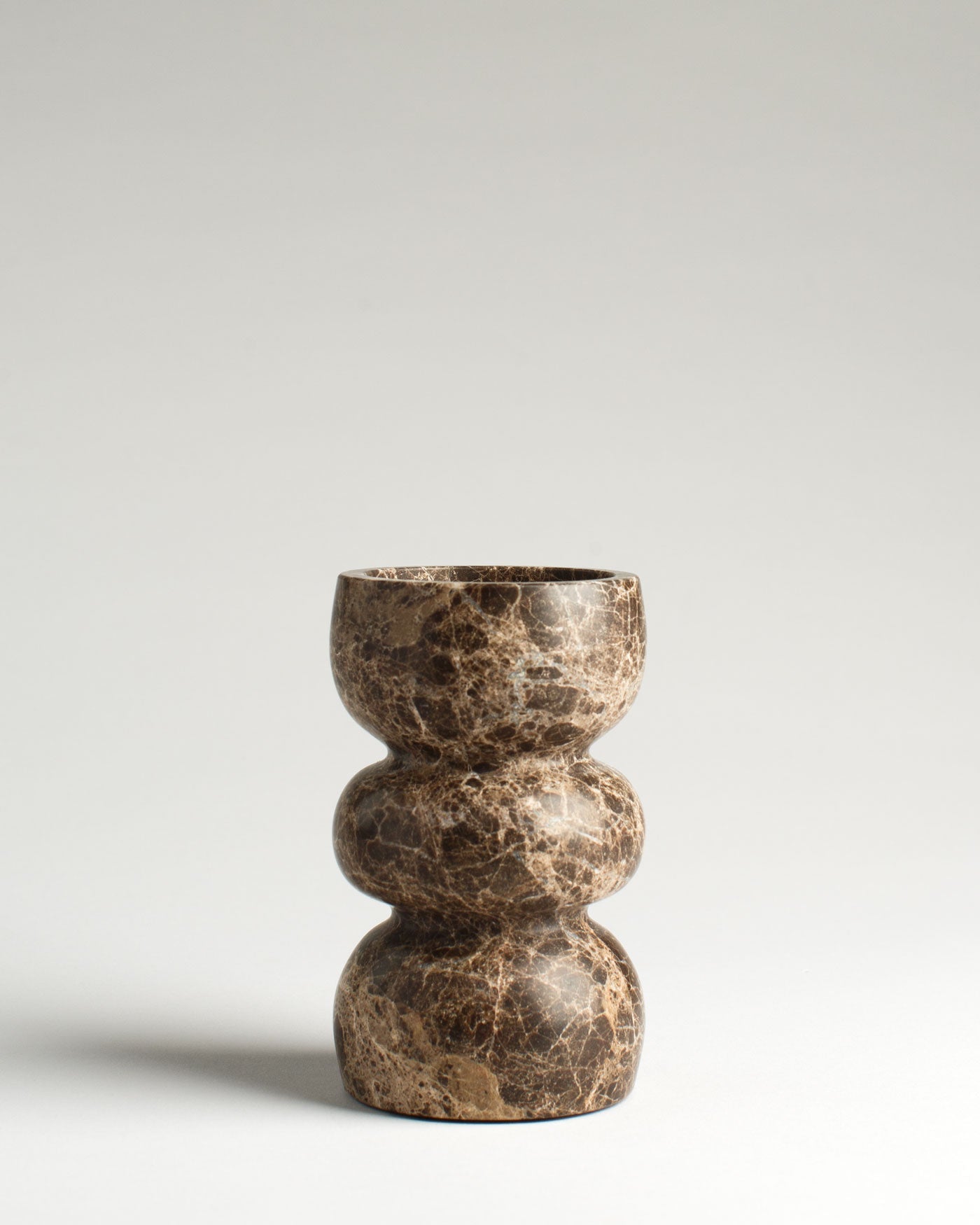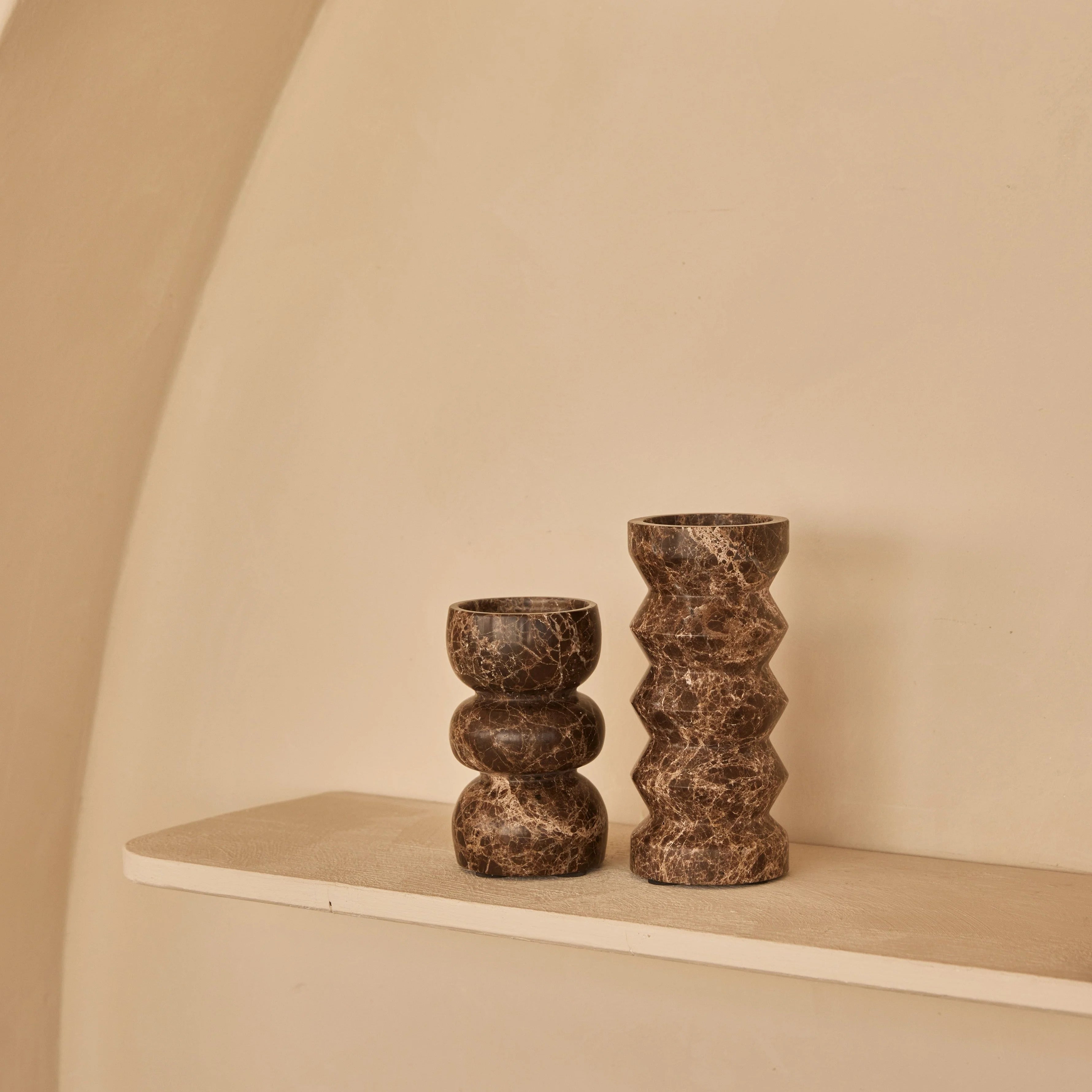 Ljusstaken Yubí i mörkbrun marmor är en prydnad för hemmet – varje bit är unik med sina naturliga ådringar. Med sin mattade yta och tunga känsla blir den ett konstnärligt inslag i ditt hem.