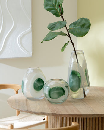 Livy är en uttrycksfull glasvas med mjuka toner i grönt och vitt.