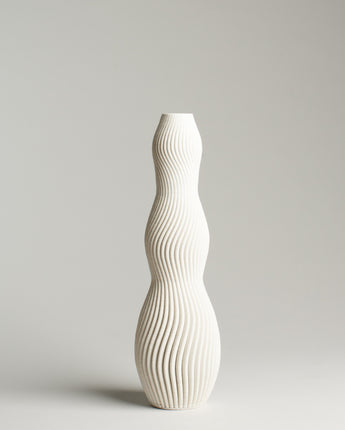 Den lilla vasen Kudos kombinerar enkelhet och skulptural känsla med sin räfflade yta och mjuka, beige ton. En perfekt detalj i hyllan – lika fin med eller utan blommor.