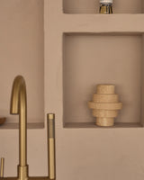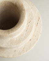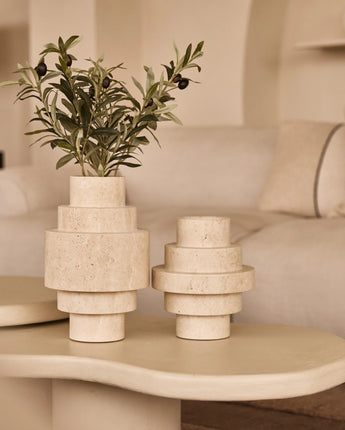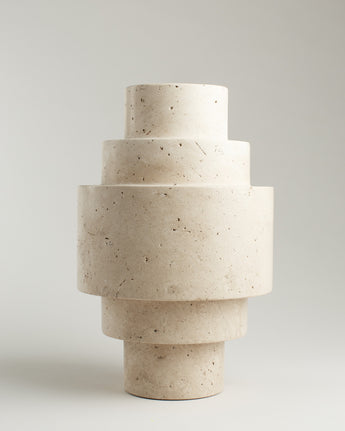 Agano Vas i travertin är en handgjord vas i travertin, vilket gör varje exemplar unikt. Den naturliga stenen ger en jordnära och tidlös känsla till ditt hem. Vasen har en rund form med en öppen topp, vilket gör den idealisk för både färska blommor och torkade arrangemang. Observera att vasen inte är helt vattentät, använd gärna en vattentät insats för att skydda mot läckage.