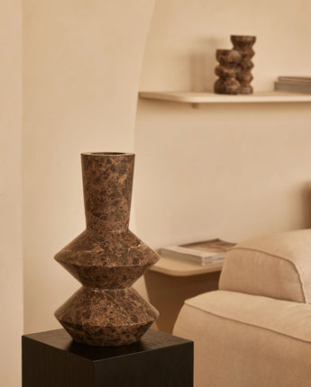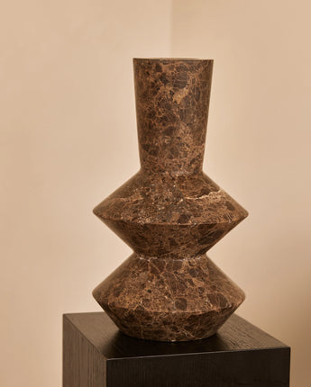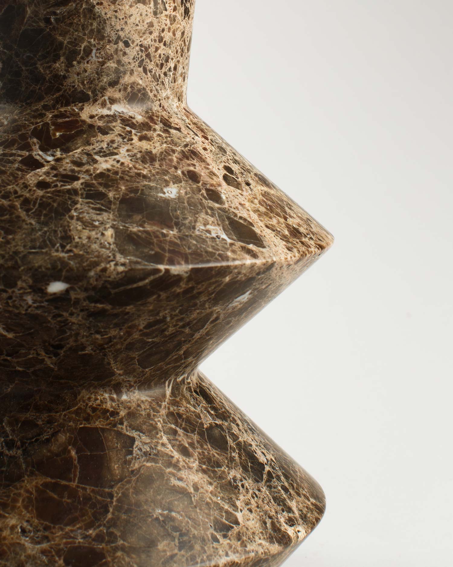 Vasen Rhombus i Dark Emperador-marmor har djupa bruntoner. Med sin höjd på 35 cm blir den ett imponerande blickfång, perfekt för större blomsterarrangemang. Marmorns unika ådringar gör varje vas unik och full av karaktär.